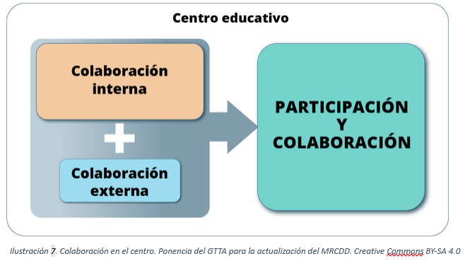 El indicador 1.2.A1.1. es muy preciso en la determinación de las situaciones de utilización de las plataformas digitales de colaboración, como por ejemplo, coordinación pedagógica en el centro y aplicación en situaciones de colaboración corporativa con docentes de otros centros educativos o con profesionales externos, tanto de servicios sociales, como de instituciones culturales, centros de investigación, asociaciones o empresas del entorno para el desarrollo de proyectos o tareas específicos. Se refiere a la competencia para el uso de las tecnologías digitales en procesos de colaboración con el fin de llevar a cabo actuaciones determinadas.